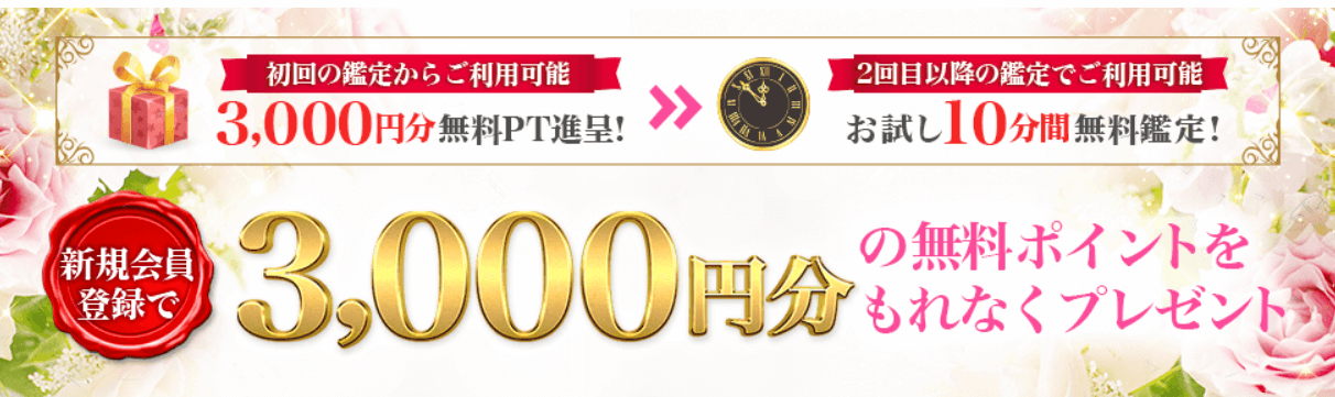 | 無料特典 | ①新規会員登録で3,000円分無料 ②初めての鑑定は優先予約 ③今なら初回お試し無料鑑定後に計3,000ポイントプレゼント |